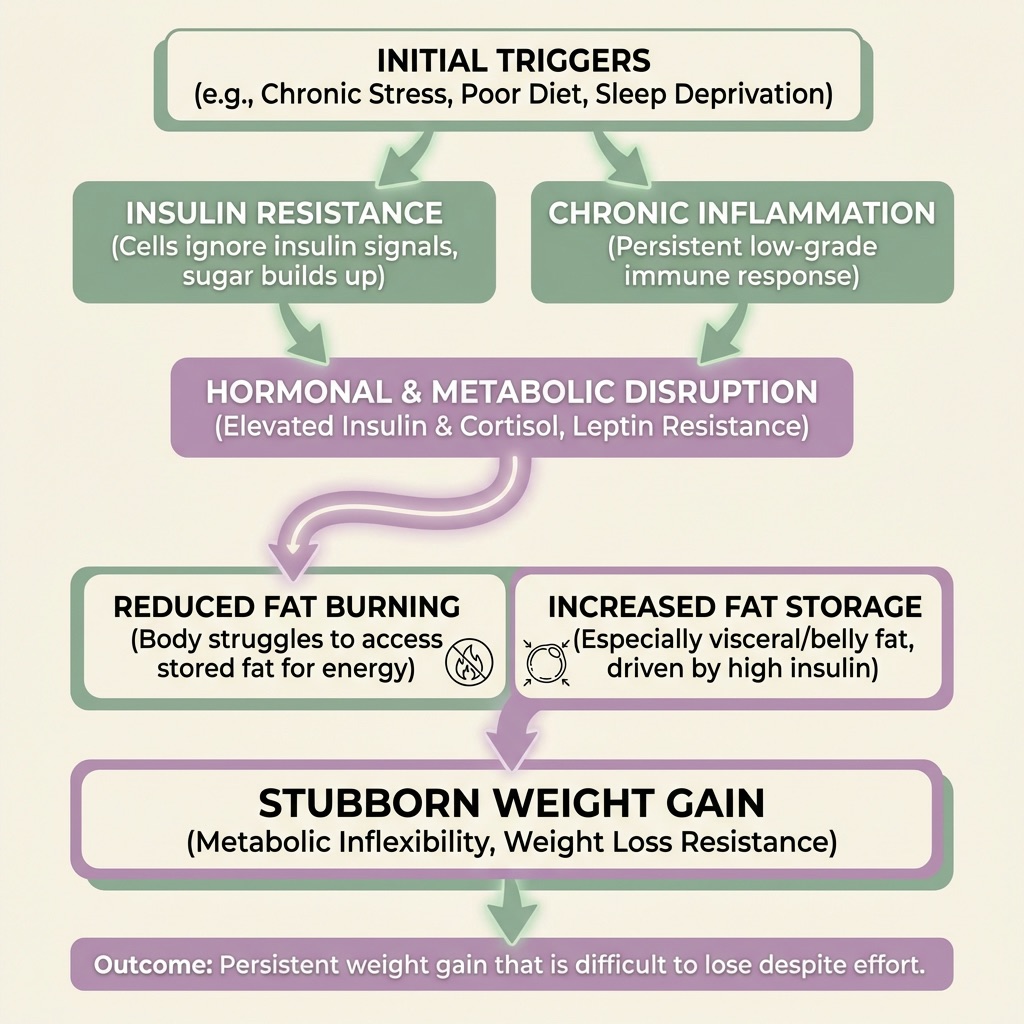 When insulin resistance takes hold, your cells stop listening to insulin's signals. Glucose can't get into your cells for energy, so it gets stored as fat. Meanwhile, you're exhausted because your cells are literally starving for fuel.